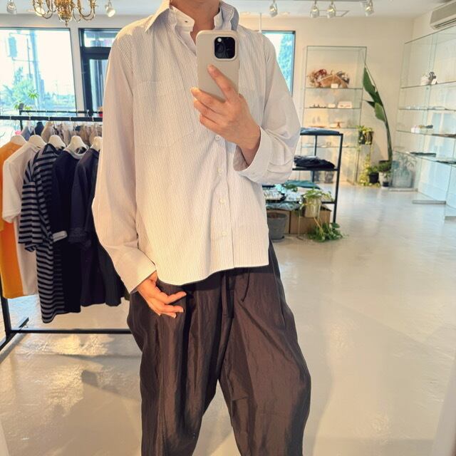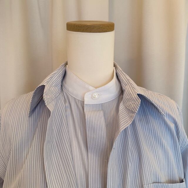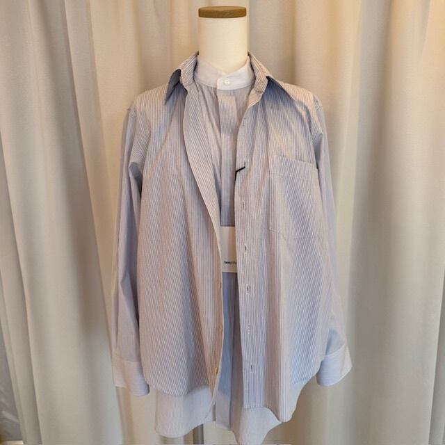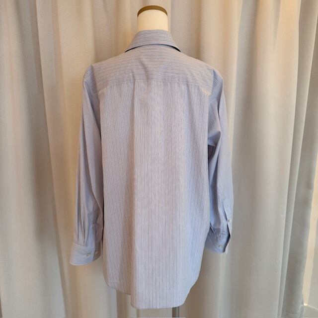前と後ろの見頃の間にもう一枚見頃を加えた三枚構造のストライプデザインシャツです。