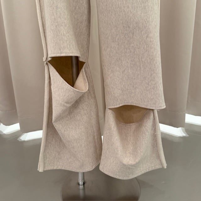 裏毛スエットのワイドパンツに左右アンバランスにカッティングを入れた、ウエストゴム仕様のデザインに仕上げました。