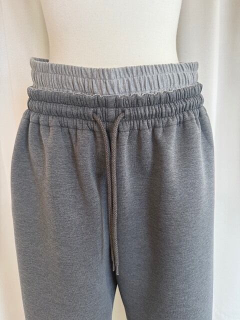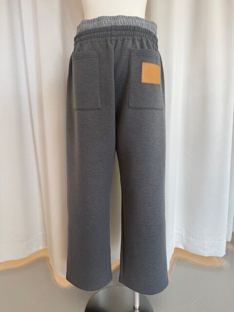 ジェンダーライン「WHERELESS」のアイコンでもあるレザーパッチ付きのスエットシリーズから今シーズンはウエストが二枚履いているかのようなデザインで仕上げております。Topsをinしても使える仕様!