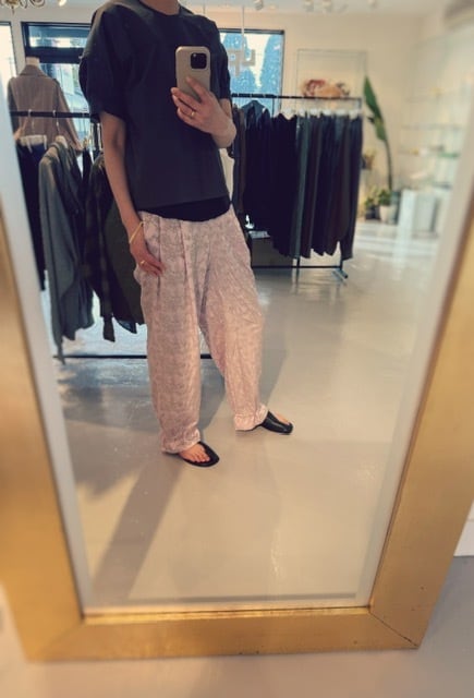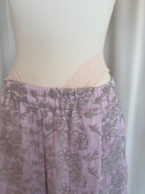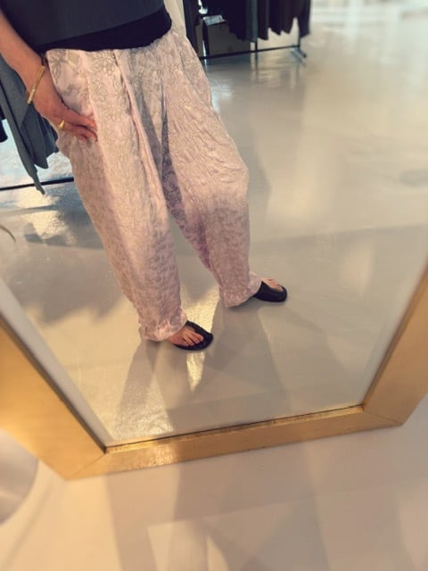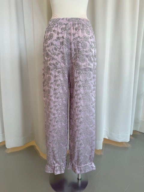 サイズ(平置き採寸):ウエスト(ゴム)29㎝、股上36㎝、股下69㎝、着丈105㎝、裾幅(絞り紐有り)21㎝、ヒップ51㎝