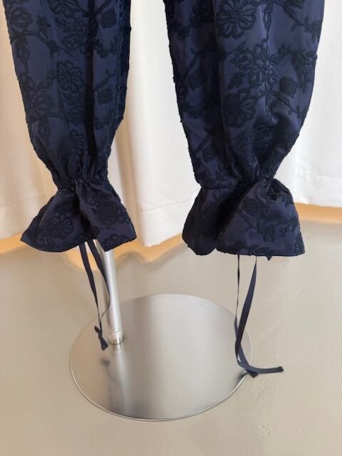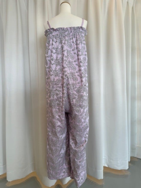 サイズ(平置き採寸):胸部分(ゴム)38㎝、股上(トップから)66㎝、股下57.5㎝、着丈123.5㎝、裾幅(スリット、絞り紐有り)31㎝、ヒップ54㎝