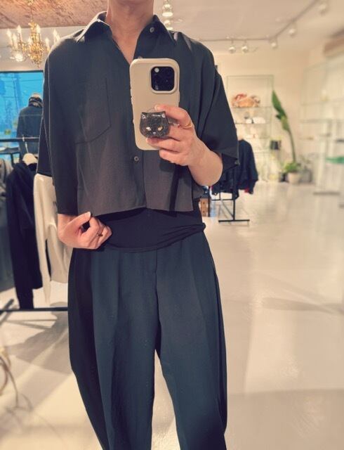 円形のフォルムが特徴的なクロップドシャツです。曲線的なラインとドレープが独特のパターンメイキングに仕上げてくれています!上質なスーティング素材を使用しておりますので、程よい落ち感が美しいラインを出してくれます。 ウール100% サイズ(平置き採寸):袖丈(襟ぐりから袖まで)43㎝、身幅72㎝、着丈47.5㎝