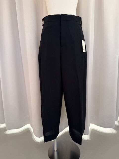 マーベルト仕様の3タックスラックスです。脇に縫い目を入れない高い技術のパターンメイキングだからこその独特の立体感は履いた時の完璧なラインを作り出してくれています! ウール100% サイズ(平置き採寸):ウエスト37㎝、股上33㎝、股下69㎝、着丈102㎝、裾幅26㎝、ヒップ46㎝