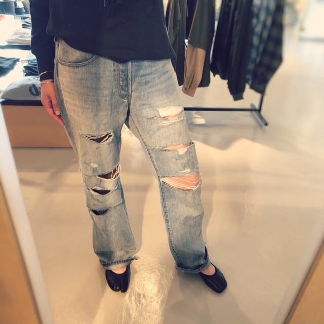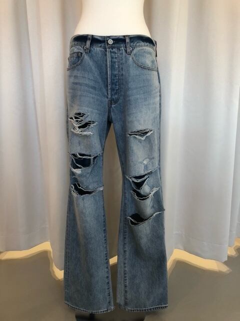 ダメージを全体にあしらい、ヴィンテージ加工を施したデニムパンツです。